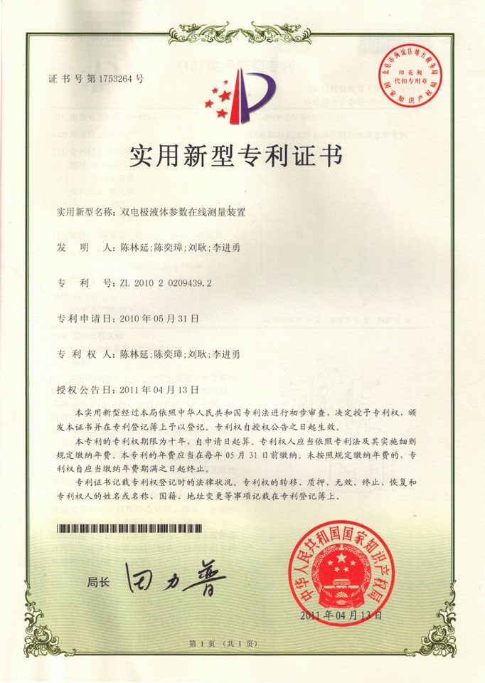 雙電極液體參數(shù)在線測量裝置(雙電極測量裝置),專利號:ZL 2010 2 0209439.2