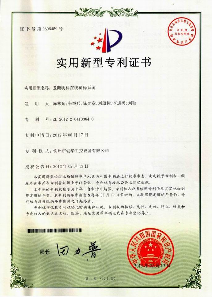 近日,我公司自主研發(fā)的“煮糖物料在線稀釋系統(tǒng)”獲得國家知識(shí)產(chǎn)權(quán)局實(shí)用新型專利授權(quán)。本系統(tǒng)是我公司針對糖廠目前在結(jié)晶過程中間歇入料,不能做到沸點(diǎn)入料及任意錘度稀釋的現(xiàn)狀而自主研發(fā)的,該系統(tǒng)安裝在原料箱和煮糖罐之間,通過PLC控制,實(shí)現(xiàn)入料溫度可調(diào),入料錘度可調(diào),并且在結(jié)晶過程中能實(shí)現(xiàn)連續(xù)入料,為結(jié)晶過程的平穩(wěn)進(jìn)行創(chuàng)造有利條件。該系統(tǒng)的應(yīng)用,對于糖廠節(jié)能降耗和提高回收有一定的幫助。