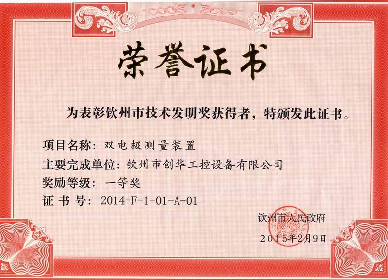 2015年12月30日下午3:00市委、市政府在市行政中心C座會(huì)議廳召開2015年欽州市科學(xué)技術(shù)獎(jiǎng)勵(lì)大會(huì)暨促進(jìn)科技成果轉(zhuǎn)化行動(dòng)推進(jìn)會(huì),我公司產(chǎn)品《雙電極測(cè)量裝置》喜獲2014年度欽州市技術(shù)發(fā)明一等獎(jiǎng)。
