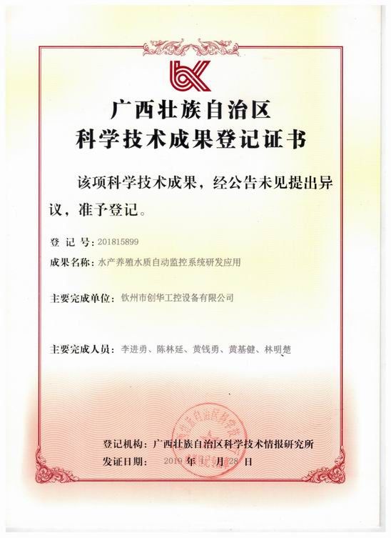 欽州市創(chuàng)華工控設備有限公司自研項目《水產(chǎn)養(yǎng)殖水質(zhì)自動監(jiān)控系統(tǒng)研發(fā)應用》喜獲成果登記。